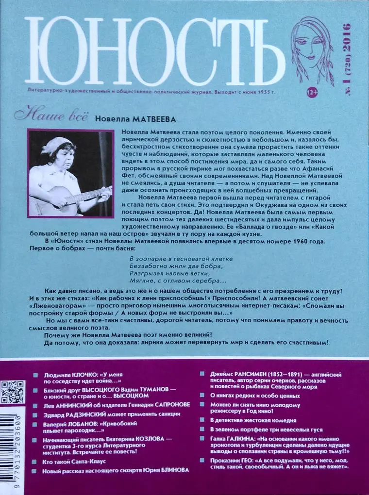 «Юность» всегда оставалась юностью, и старалась идти в ногу со временем: и по советским курантам, и по маленьким наручным часам каждого читателя. Поэтому, кроме литературных новинок, — от обязательного сюжета о великих стройках до Ахматовой — здесь существовали постоянные рубрики «Наука и техника», «Спорт», дискуссионная «20-я комната». В конце каждого номера журнала — юмористическая рубрика «Пылесос» (переименованная позже в «Зеленый портфель»)